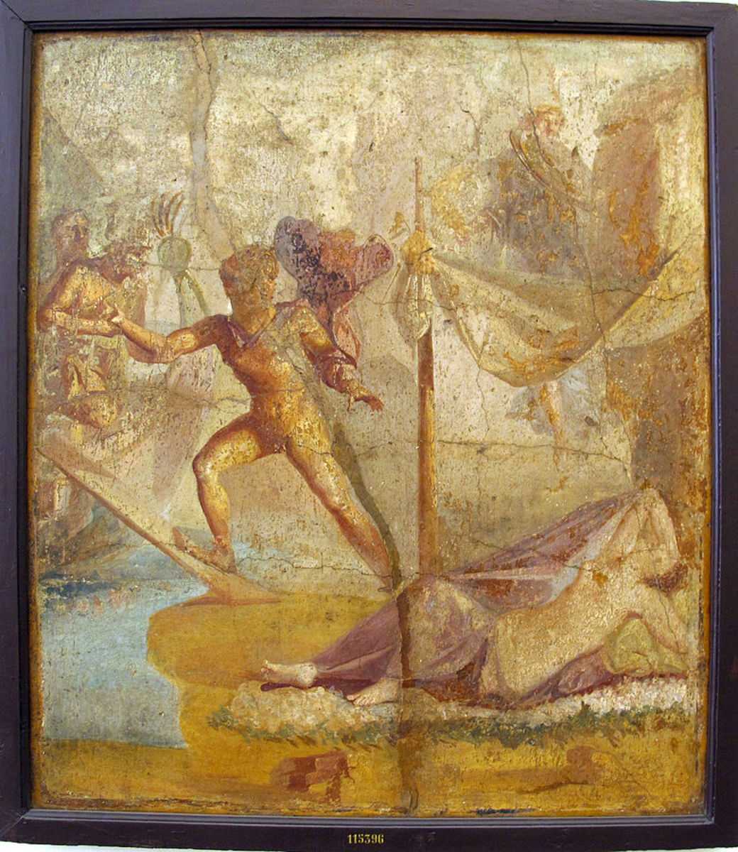 Помпейская фреска с изображением Тесея, крадущего на борту корабля, оставляя Ариадну спящей.