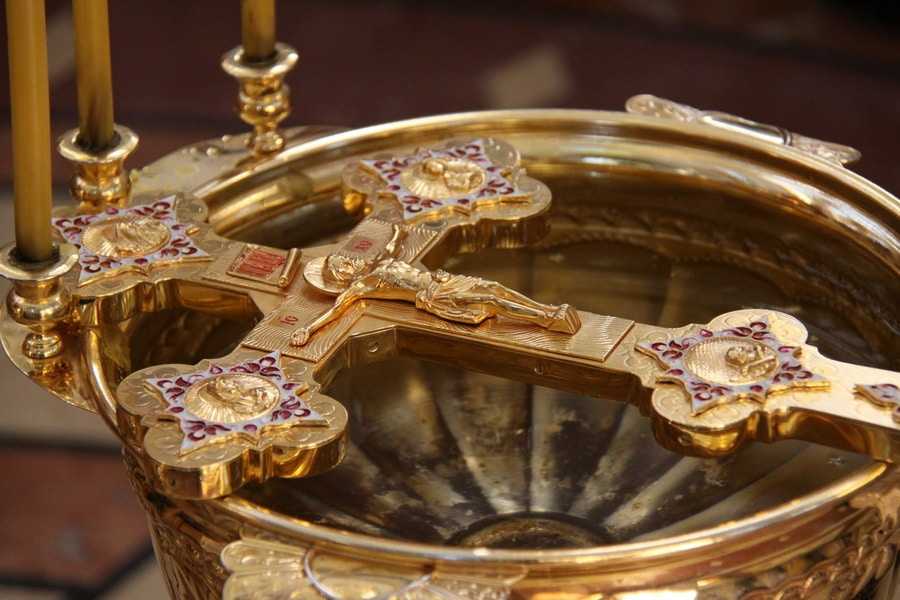 - Для водосвятия на стол посреди храма устанавливается чаша, наполненная водой, Распятие и Евангелие, зажигаются свечи.